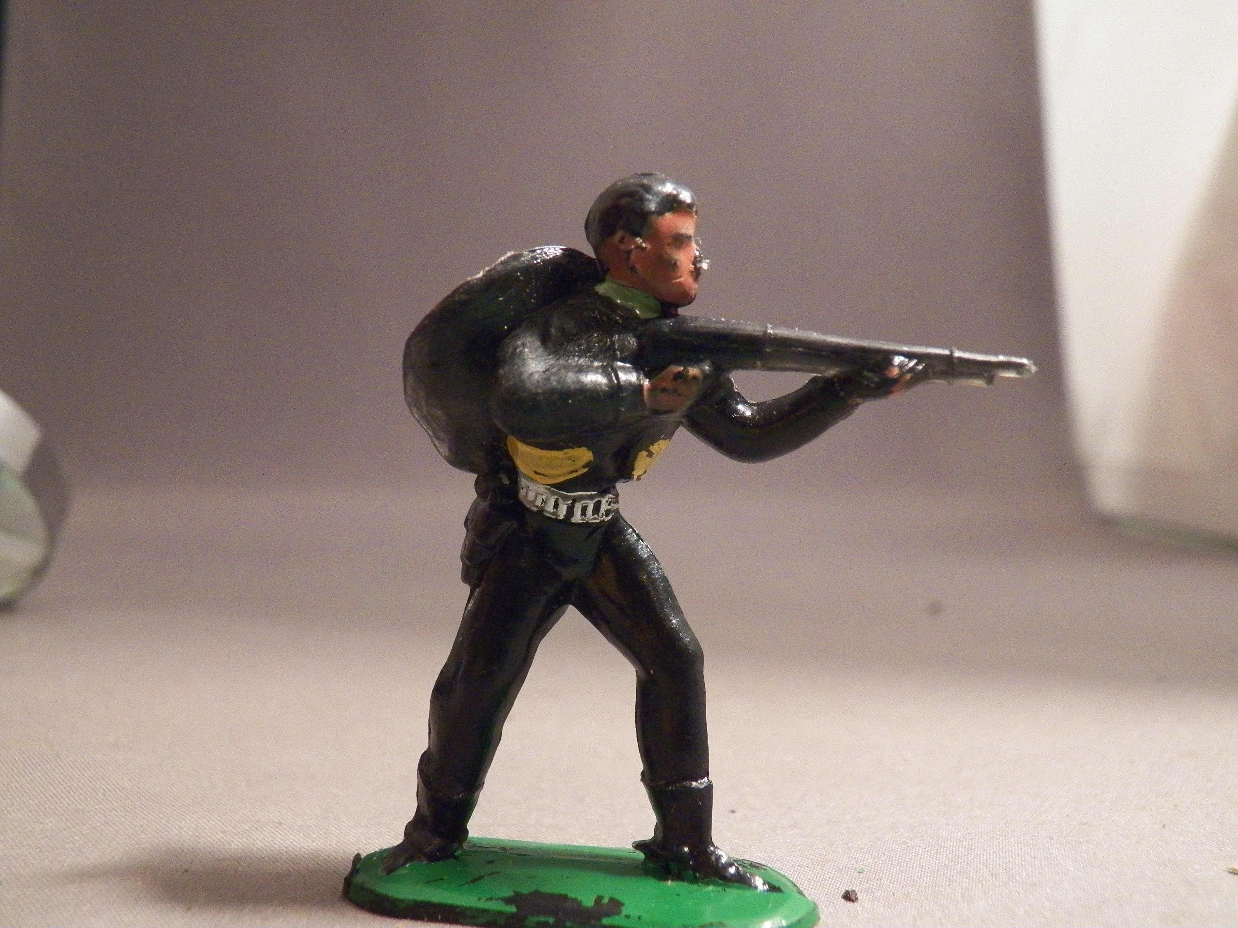 This figure which is the 54mm Marx cowboy with rifle is actually a copy from Greece. I got it years ago on a blister card, but the card got damaged. I remember the card had a couple Marx figures plus a mounted one piece figure I did not recognized.
