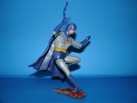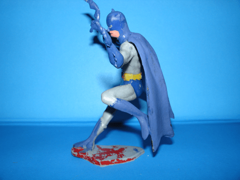 In my reportĀ on Plastic Warrior show I mentioned that my very good friend Peter Evans picked up a Batman figure from Hong Kong. Peter has now had a chance to do some pictures of it. It is a copy of the Ideal Batman. Peter compared the figure to his Ideal Batman figure and could see that it was slightly smaller which means the company pantagraphed it. Peter believes it was a cake decoration. the interesting question if they did other Ideal Super Heroes.