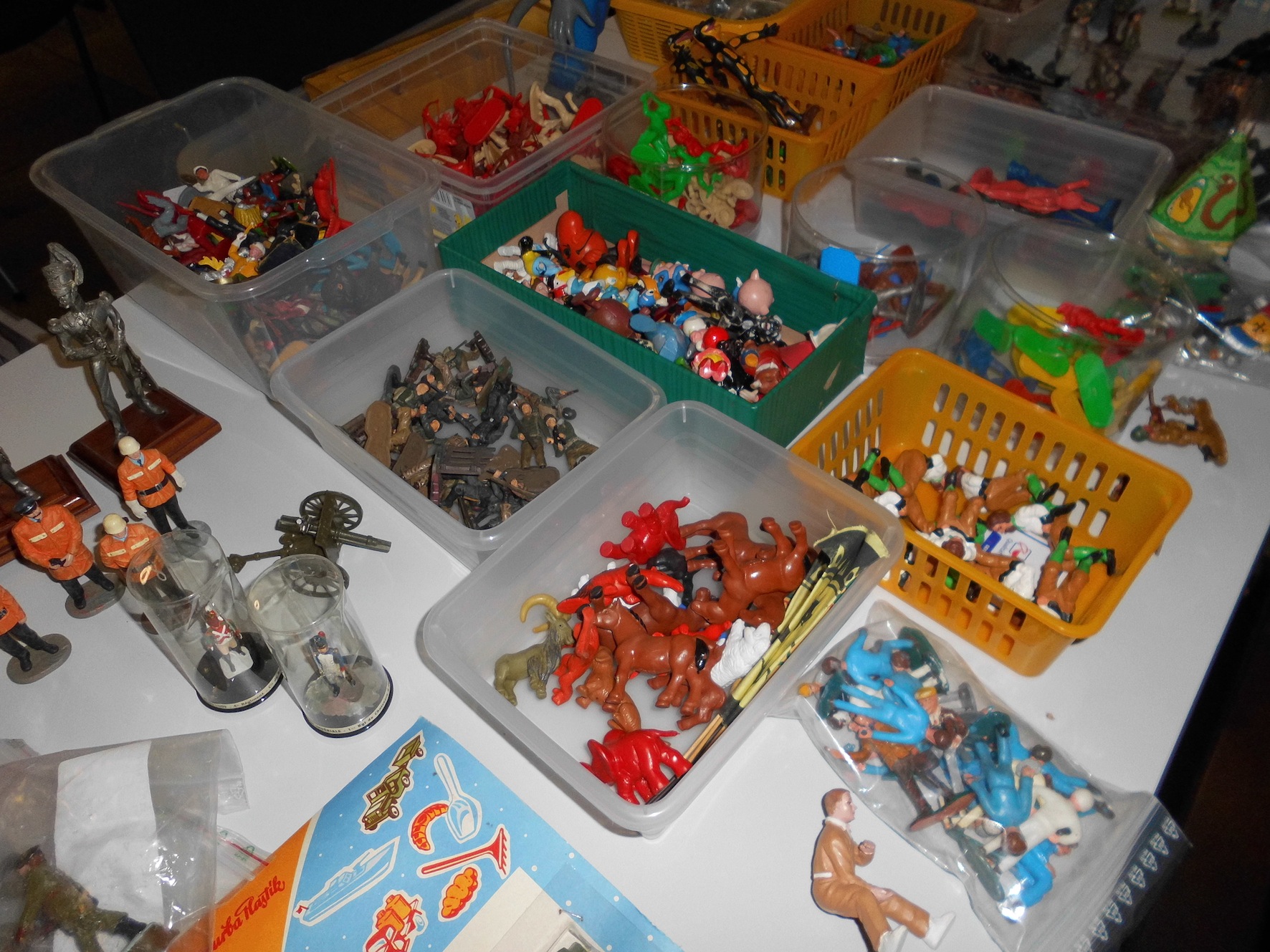A bucket of figures to sort through . There is a MPC cowboy in there besides other figures
