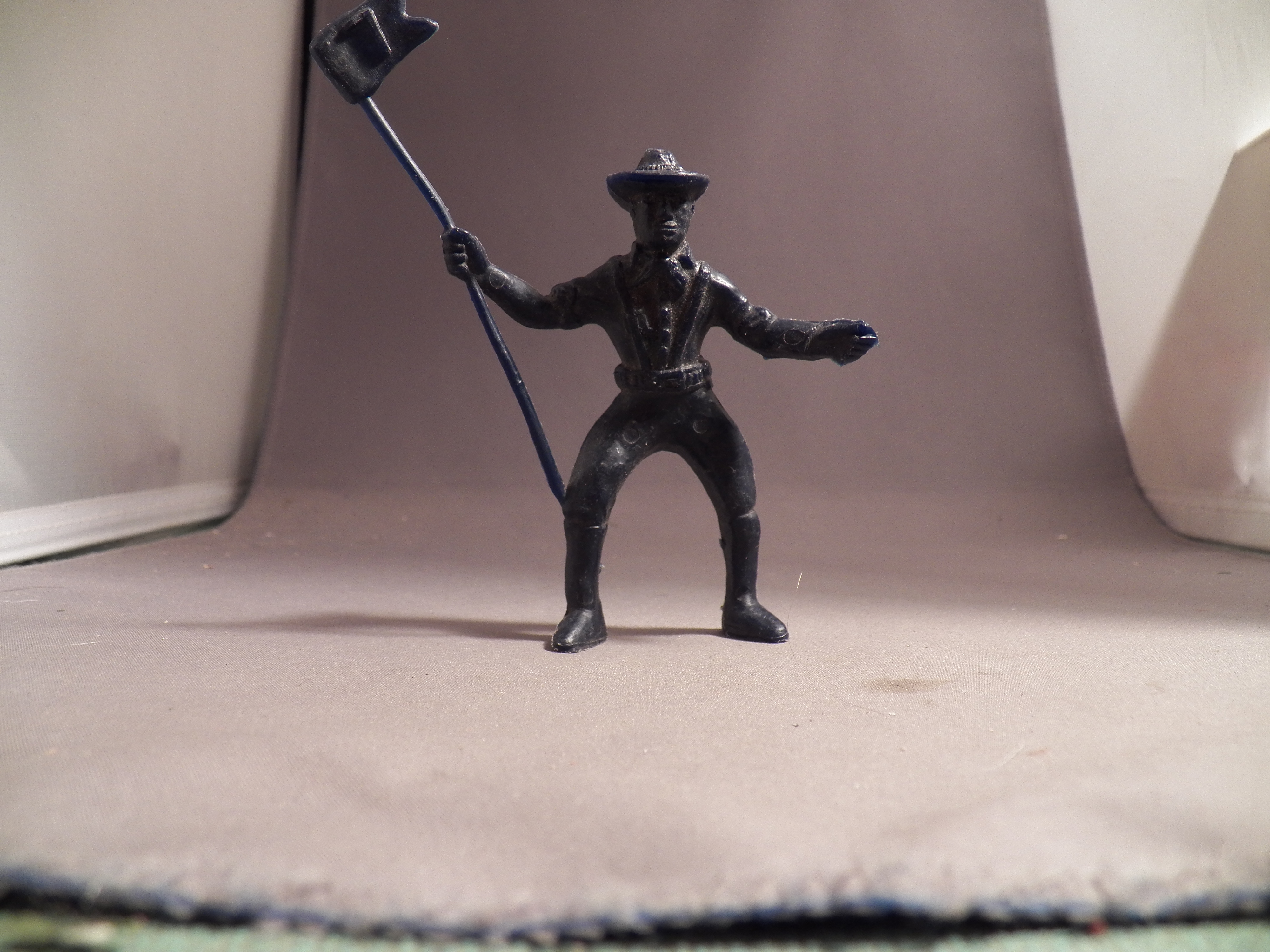 Here we have a Payton cavalry soldier with guidon. As a child I had the other poses but not this one. I did not know this one exist until Laurie and I were at a flea market. We were walking the building when I spotted a set of figures. There was that pose. At the time I did not buy the set as I had the other poses and the price. I did a search and found one. The Payton cavalry were also in Gray and a different shade of blue.