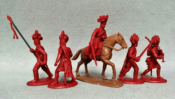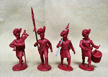 The set contains 9 model soldiers plus 1 horse model; comprising of 1 Colonel (mounted); 2 Ensigns, 1 officer in kilt, 1 sergeant, 2 bagpipers and 2 drummers. There are option arms for the ensigns to be converted into officers and for extra replacement arms for piper and drummer.