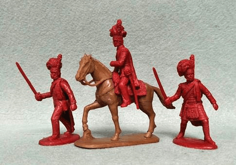 The set contains 9 model soldiers plus 1 horse model; comprising of 1 Colonel (mounted); 3 officers in kilt, 3 in overalls, and 2 in overalls with plaid. There are option arms for flank coy officers (fringed shoulder wings).