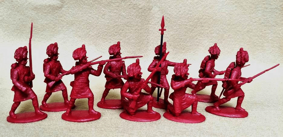 The set contains 9 model soldiers; comprising of 1 sergeant; and 8 other ranks with arms options for various action poses. The models of this set are the same as that of 54 BRT 02 Highlanders, Flank Coy. except for the arms. These are supplied with arms having woollen tufts at the shoulders instead of the wings of the flank companies. This set is offered as a convenience for those collectors who wish to have such specific details in their models.