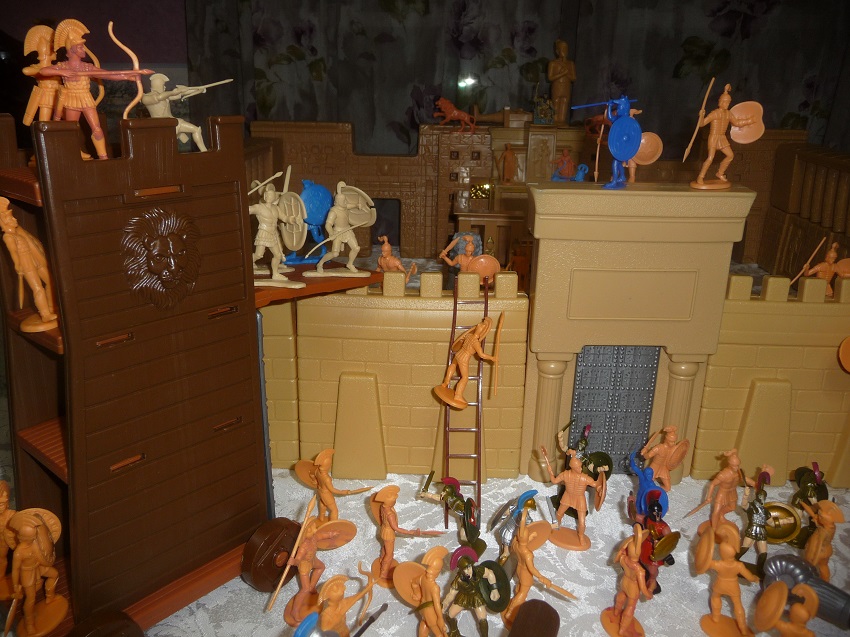 I just did a quick sample using two playset combined and set up with out proper detail. I just put some figures to give an idea, not thinking in create an actual playset. All after I mention before that the Troy horse was done