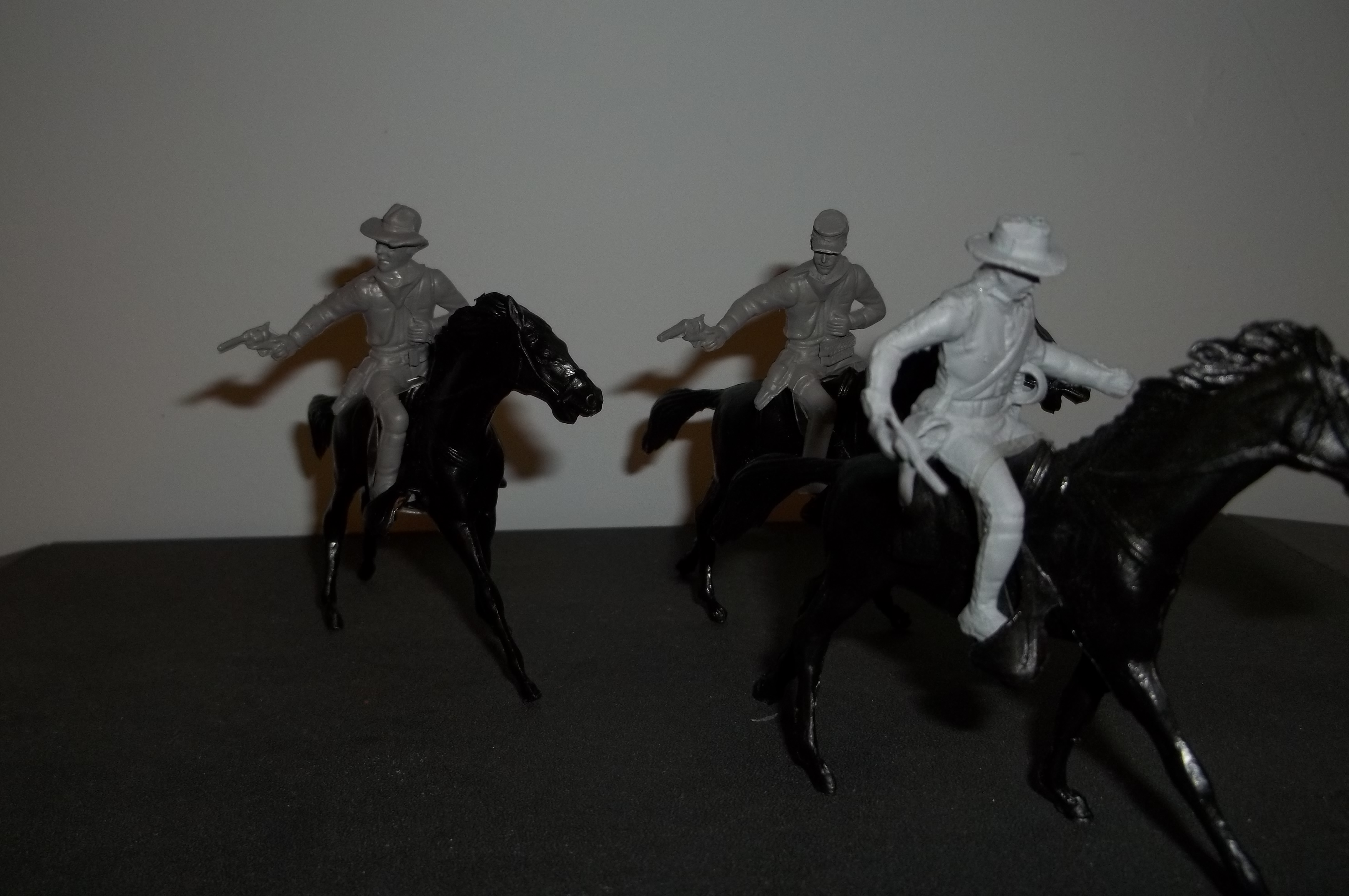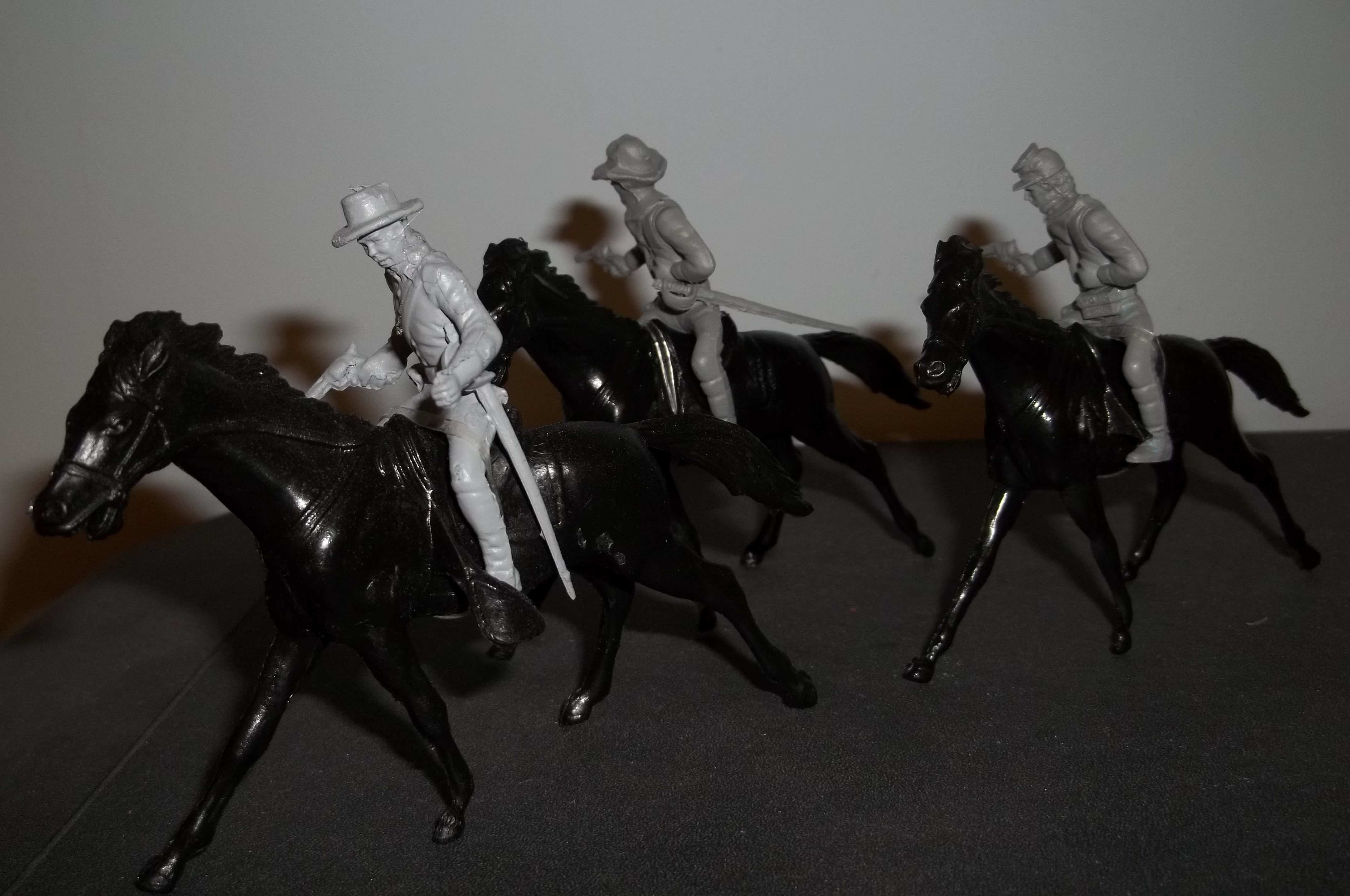 Last of the Recruits Greg Liska is back with some more cavalry figures. Here is what he had to say. All Marx scrap figures. Heads are non-Marx on 2. Can you ID the figures’ former occupation before they joined the cavalry’? They reported for duty in General Salad’s command just an hour ago.