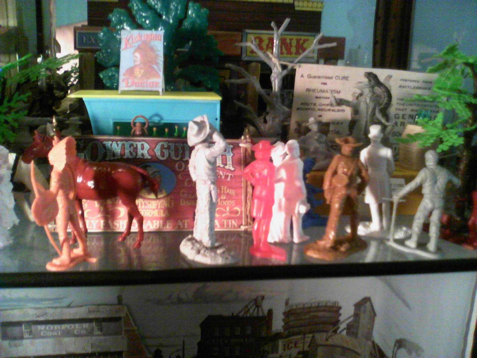 Connected white man/woman came from Larry Patterson years ago. Top hat guy is from a Preiser Elastolin kit. Brown guy is Conte resin Alamo Travis. Red cowgirl is Penny. Signs are from computer & mounted on cardboard. Big one is tied with thread (rope) to Marx dead trees. Wagon is Hong Kong Wild West Timpo copy via way of Argentina. Guy leaning on pick is recast Arctic Explorer. Indian is Rubenstein. His horse is from an MB kit made in Russia. Yellow platform is Marx circus. Tall cowboy is Valiant Miniatures resin kit. Blue fiddler is Replicants. Guitar & accordion players on bottom are Larry Patterson P&P. Guitar player on top is Marx conversion. Guitar is Marx sprue accessory. Doctor with bottles is a P&P conversion. White horse on left is Dom with Marx harness. I think that covers it all. Got idea from Revell model kit. The “show” keeps evolving as I get new ideas for add ons. It now has some Timmee chickens, etc.