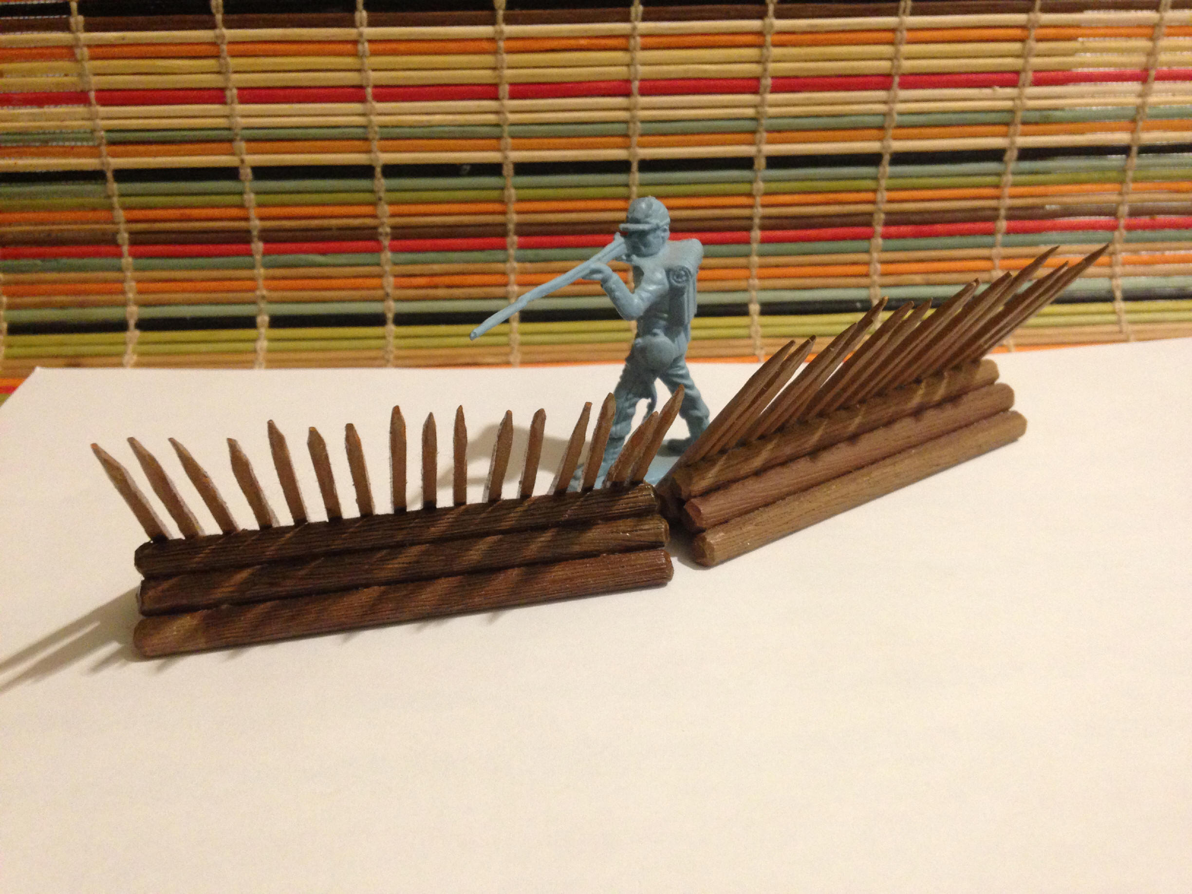 Here is a project for those handy with a hobby knife; how to make a spiked barricade from 4 popsicle sticks and a section of 1/4 inch dowel. Very inexpensive to make, it does require a drill press to make the holes in the dowel. The model is based on the 1865 photos of Confederate defenses used in Petersburg, Virginia. The third photo shows a different type of spiked barricade made from the same size spikes and dowels, known as a ‘fraise’.